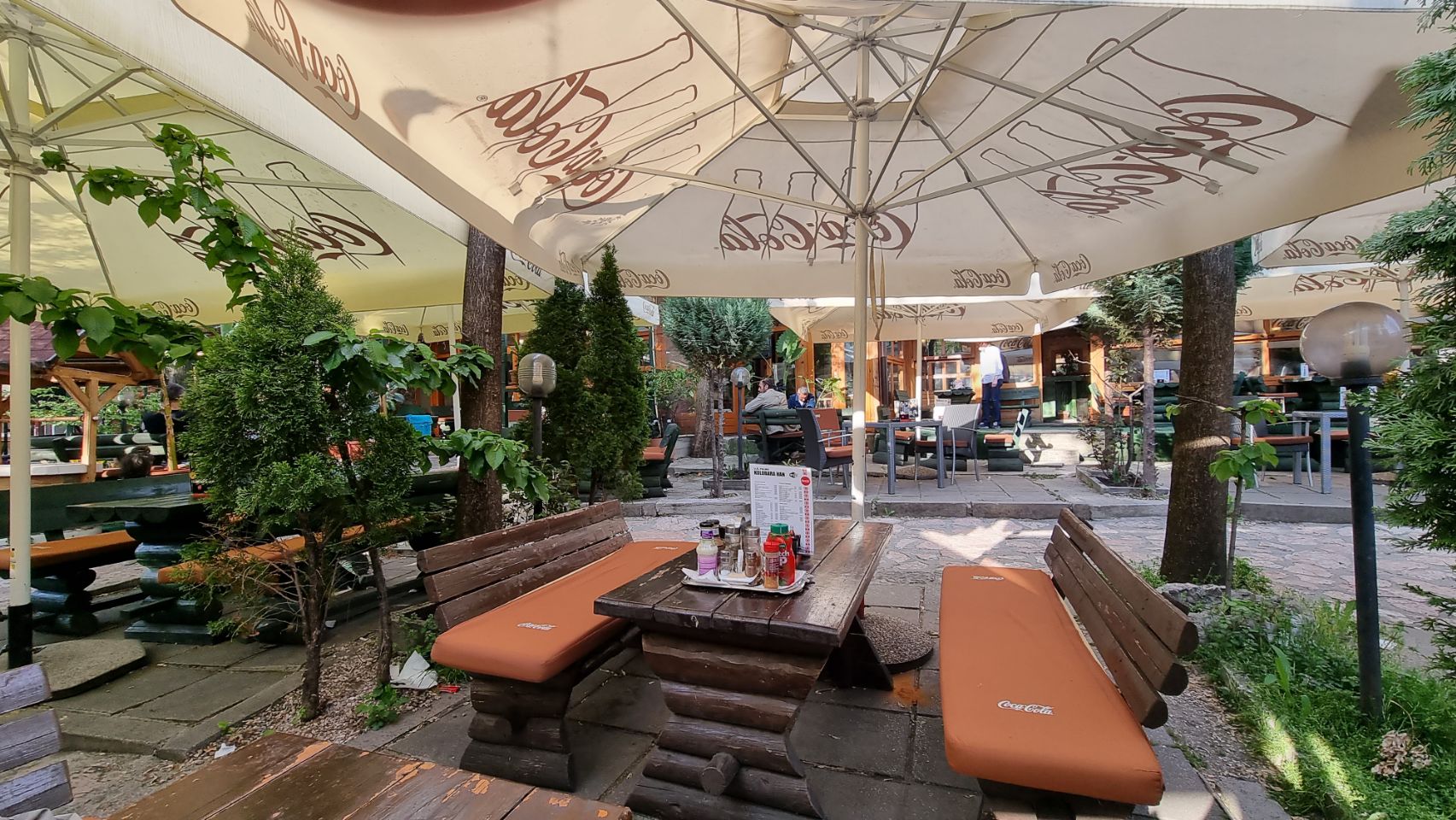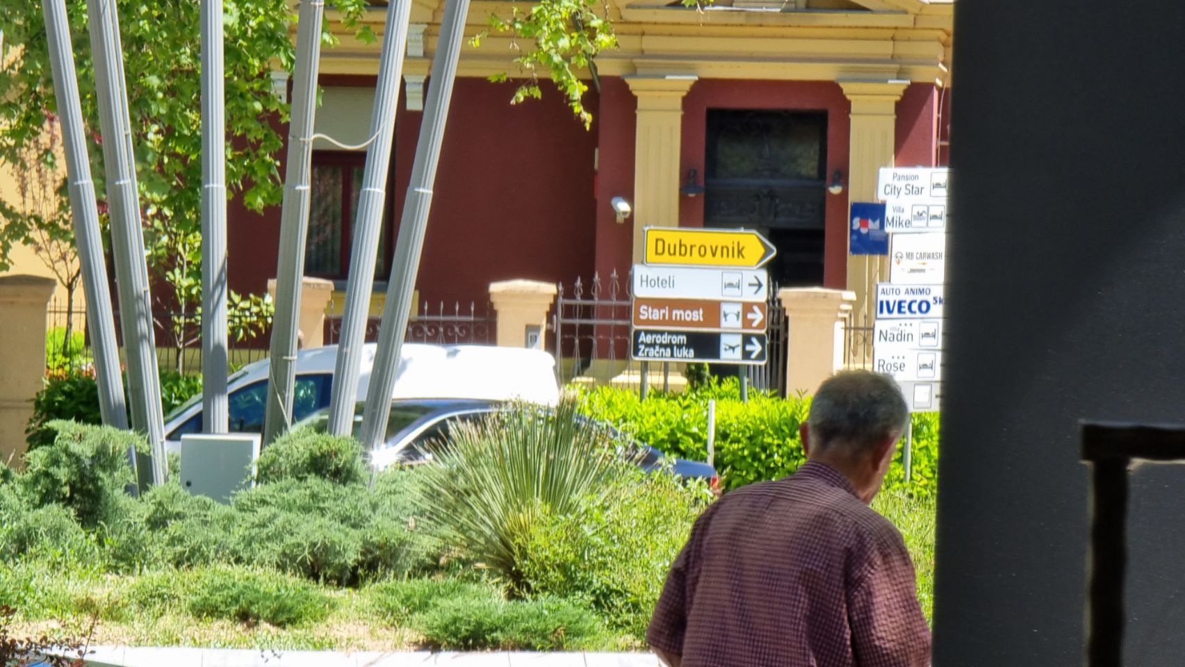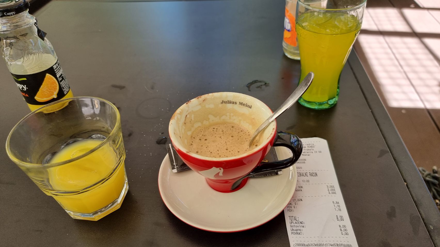 Overal volle terrassen rond middaguur. Toch wel een beetje opmerkelijk; modaal loon is €500 per maand en meer dan een kwart van de bevolking is werkloos. Ok, de prijzen op het terras zijn grofweg de helft van Nederland maar dan nog… ( let op het bonnetje voor drie consumpties — Cappuccino, Fanta, jus —, de eindrekening met het getal 8 is geen euro maar 8 Bosnische Mark en dat is €4. De wegwijzers wijzen in dit gedeelte naar Dubrovnik (Kroatië) in plaats van de hoofdstad Sarajevo.