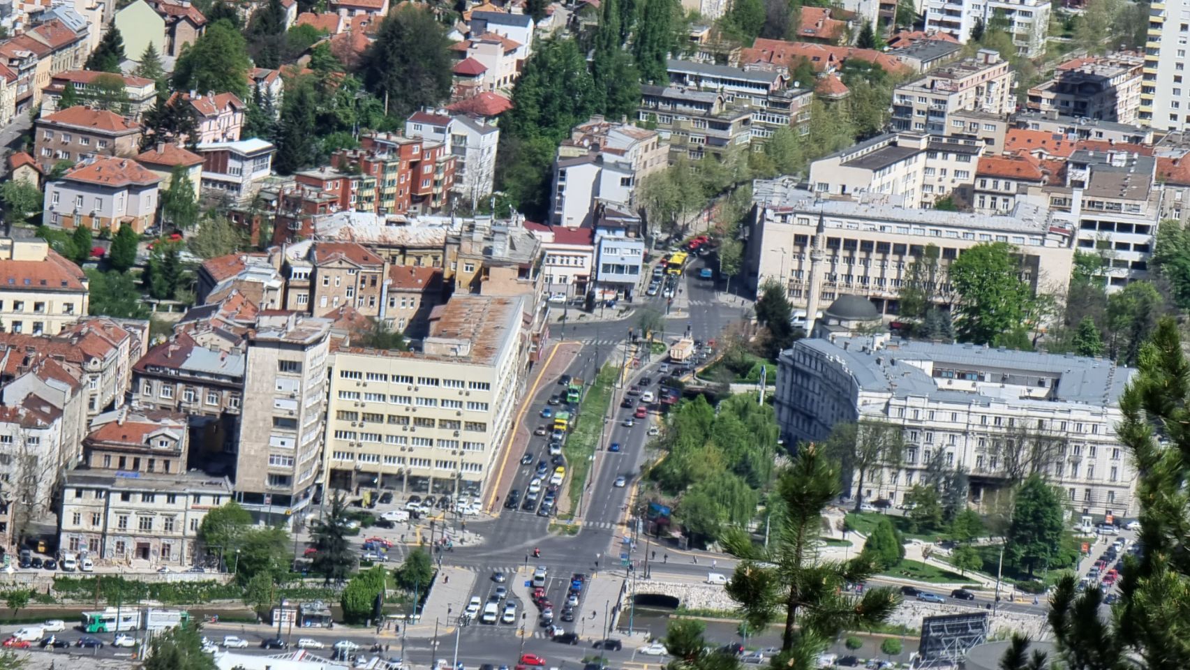 Sarajevo heeft ongeveer een half miljoen inwoners en ligt langerekt in een bergdal doorsneden door de Milijacka rivier