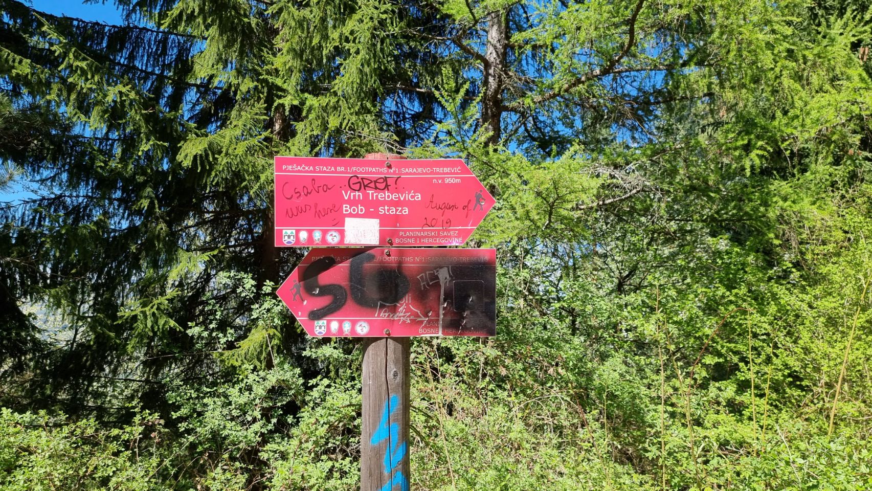 Vanuit het kabelbaanstation op de Trebevic berg op 1160 meter kun je teruglopen naar de stad. Het is een interessante wandeling die voor een gedeelte over het tracé van de oude olympische Bobsleebaan gaat. Bij het kabelbaan station is een self service restaurant waar je goedkoop iets kunt eten of een koffie kan pakken. Er is ook een overzichtskaart met de wandelroutes. Wij hebben de route, gemarkeerd met rood/wit gelopen. Bij het begin is het even zoeken of vragen naar het begin van de bobsleebaan maar als je die hebt gevonden kun je gewoon naar beneden lopen over de baan tot het einde. Dan is het weer even zoeken om met rood/wit markering verder omlaag te lopen. Bij het naderen van de buitenwijken van Sarajevo moet je enigszins improviseren maar met je telefoon als navigatie moet het lukken. Flinke afdaling maar (goed) te doen met een klein beetje conditie. Duur ongeveer 3 uur.